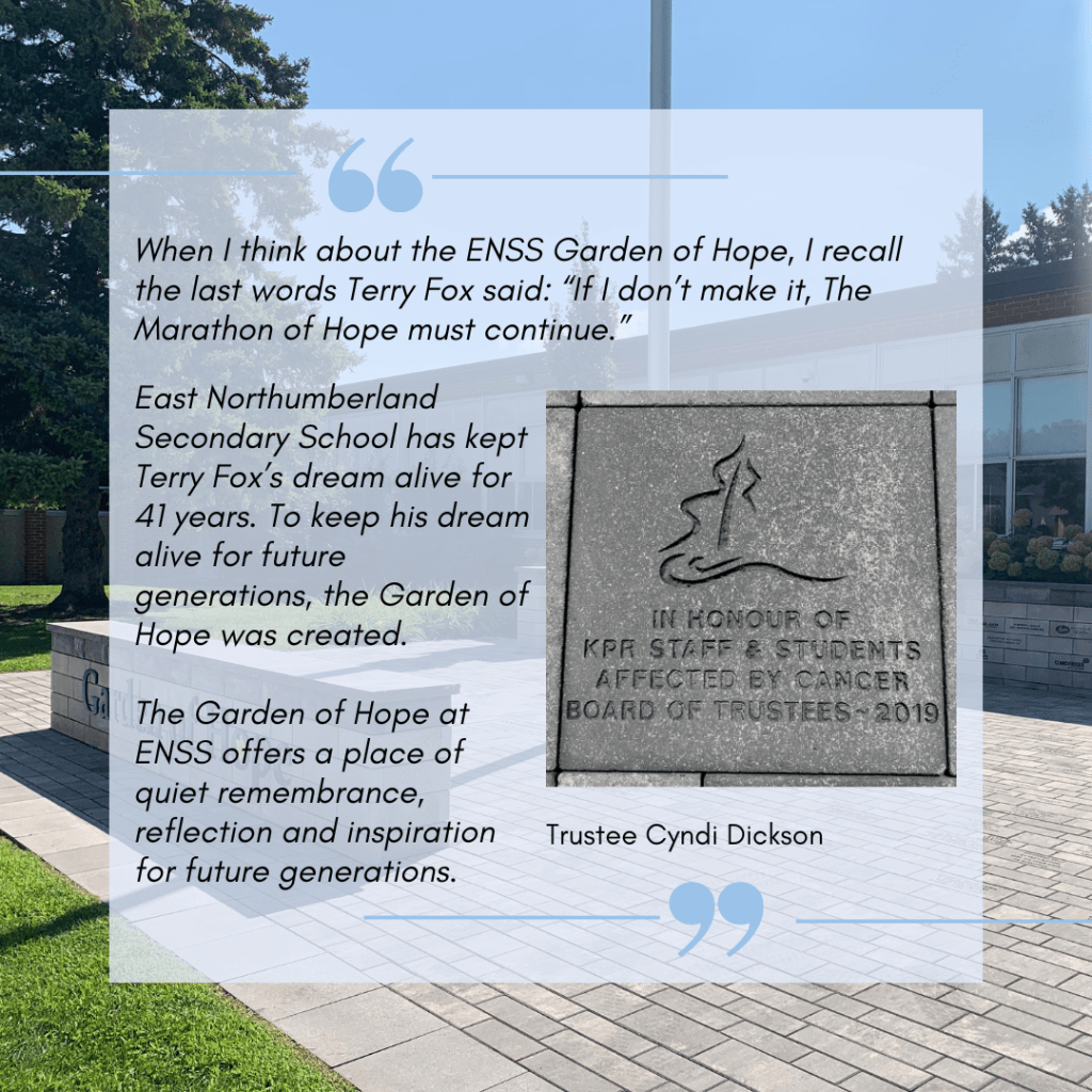 ENSS got involved quickly in fundraising for the fight against cancer and, as many know, it has been one of the top fundraising schools in the entire country. Betty Fox visited the school several years later, and the gym was named after Terry as a result, and then even later the street in front of the school was renamed in Terry’s honour.